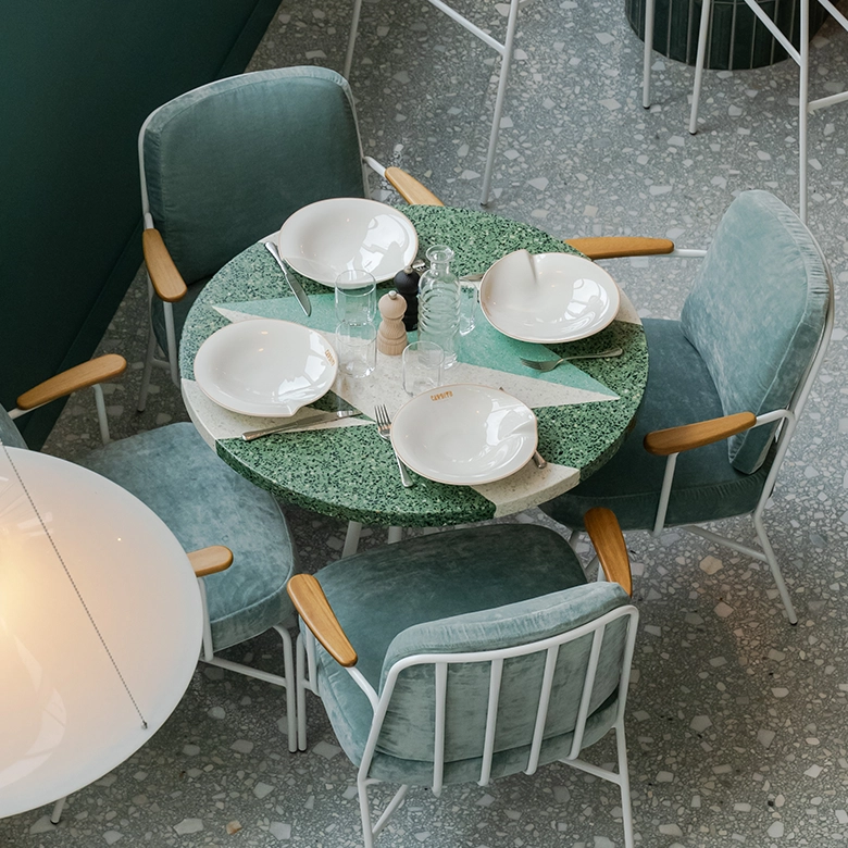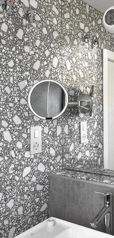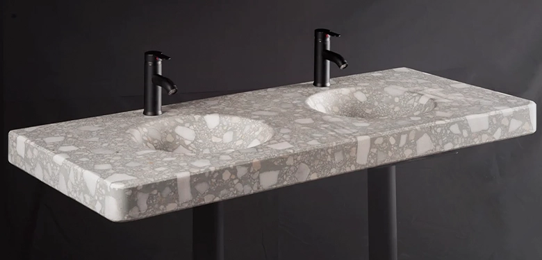 Terrazzo features a random blend of marble fragments (5-40mm) in a high-performance concrete binder.